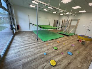 In der neuen Turnhalle stehen den Kindern außergewöhnliche Möglichkeiten für ihre Körperwahrnehmung zur Verfügung. Durch eine großzügige Spende des Elternrates, können sich die Kinder unter anderem auch an einem großen “Schwung- bzw. Sprungtuch” erfreuen. Zur Entspannung und Psychomotorik haben wir außerdem eine Sinnes -Schaukel. Unsere neigbare Sprossenwand ist vielseitig einsetzbar und wird von allen Kindern gerne genutzt. Bälle, Tücher, Seile und vieles mehr finden sich in unserem großen Materialschrank wieder.