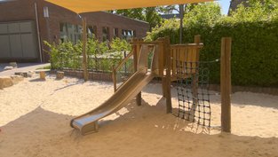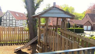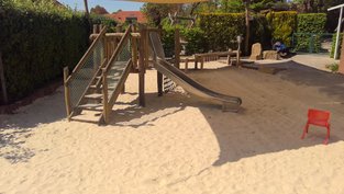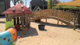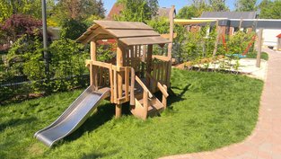 Es gibt vielfältige Spiel- und Bewegungsmöglichkeiten, wie einen Kletterturm mit Rutsche, ein großes Spielhaus auf einem kleinen Hügel und darunter einen Tunnel zum durchkriechen. Eine Spielzeughütte und ein großer Schrank gefüllt mit Sandspielzeug und verschiedenen Fahrzeugen bereichern unser Außengelände.